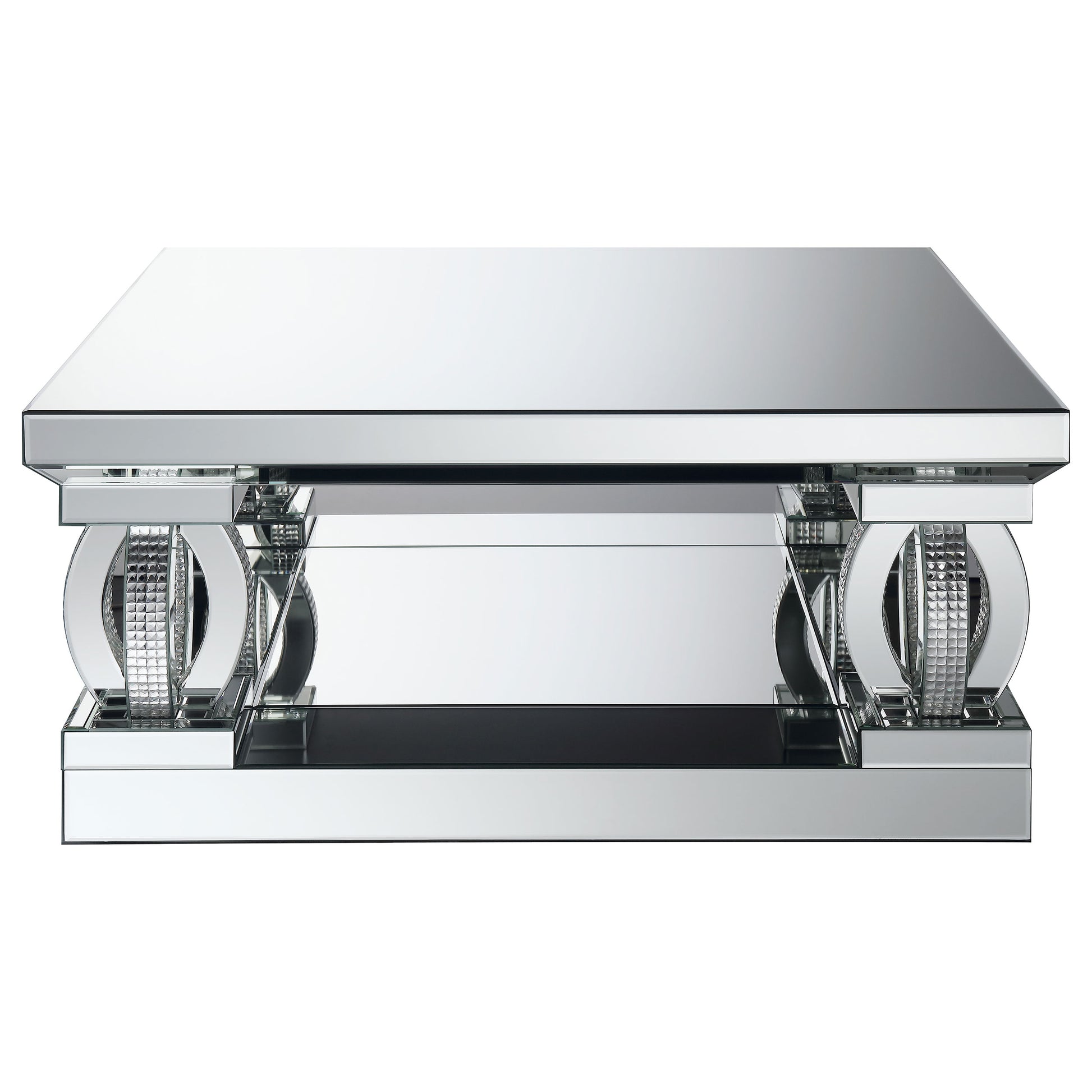 This coffee table set brings contemporary sophistication and modern luxury to your living space. Featuring a 40-inch square coffee table and a matching end table, each piece showcases mirrored surfaces and sculptural oval-shaped supports adorned with sparkling rhinestone accents. The coffee table offers a large top and base for symmetry, while the end table adds compact elegance. Perfect for displaying decor or hosting guests, this set is a captivating blend of style and functionality.