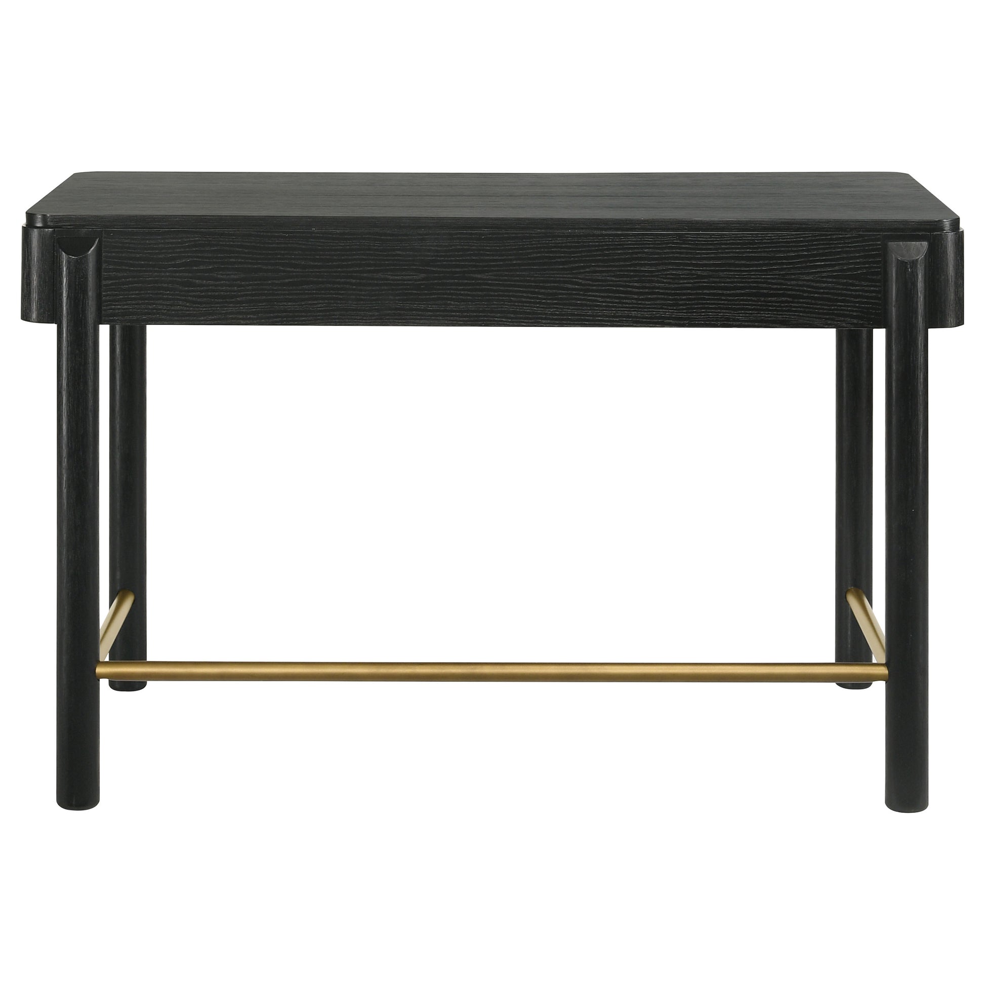Complete your bedroom or living area with a multi-functional modern coastal vanity desk with a hint of glam personality. Its soft black finish is rich, but neutral, complementing in virtually any setting and showcasing wood grain details. Two drawers create plenty of space, perfect for stashing cosmetics and accessories or desk supplies. Gold finished ball knobs accentuate the drawer fronts, while front legs extend across the desk's apron to create a sense of depth and dimension. Add a mirror to turn this table into a spot for hair and makeup, or bring your laptop and work from home.