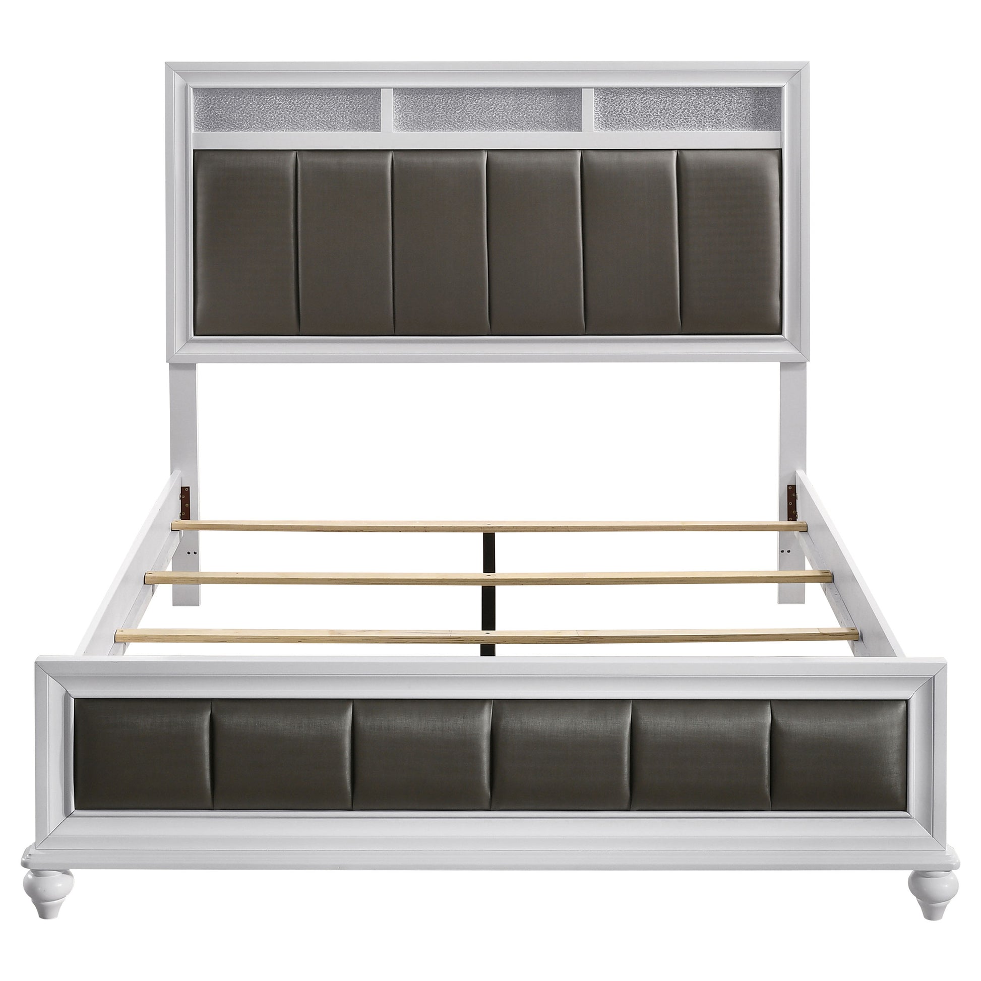 Transform your bedroom with the elegant design of this white set. The panel bed showcases metallic leatherette channel tufting framed by crisp molding and finished with turned feet for timeless charm. Coordinated storage brings added sparkle with glittery acrylic panels and faceted crystal hardware, blending modern radiance with classic details. Sculpted bun feet complete the look, while solid rubberwood, engineered wood, and okume veneer provide durability for lasting beauty and function.