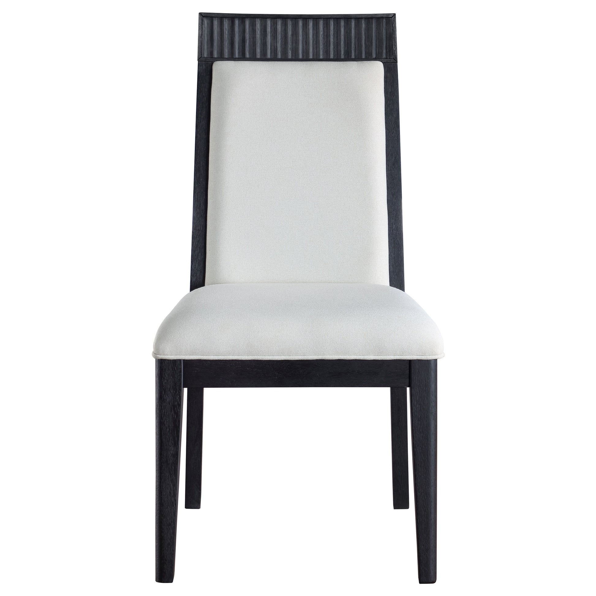 Elevate transitional dining spaces with this striking side chair, blending minimalist form and modern texture. A soft ivory upholstered seat and backrest provide a crisp contrast to the bold black frame, crafted from rubberwood and engineered wood. Vertical grooving along the top rail adds a hint of dimension, while subtly angled legs complete the refined look. Perfect for casual or formal dining, this accent chair delivers style, support, and everyday comfort.