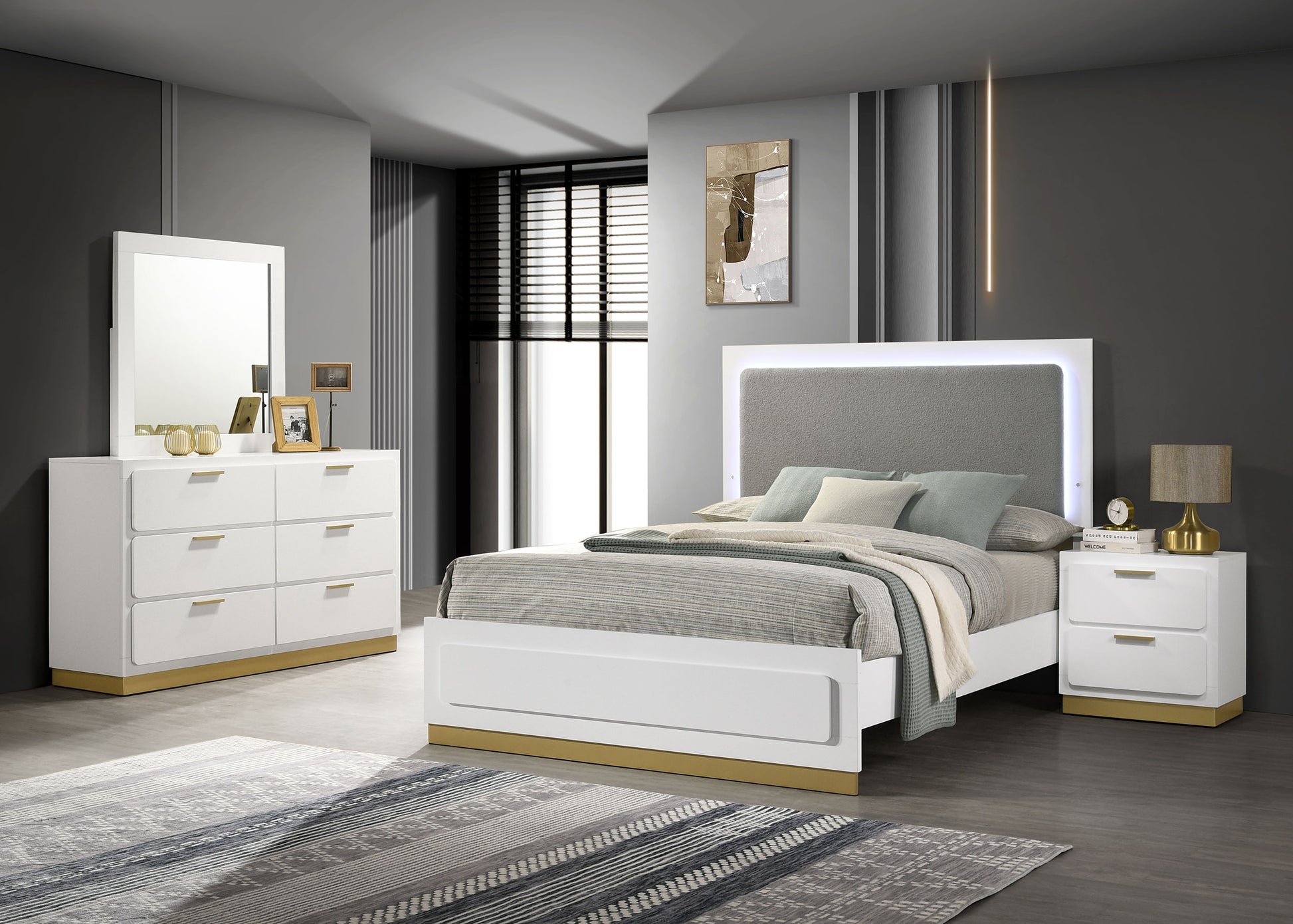 • Bed features an LED headboard with a soft light grey upholstered panel