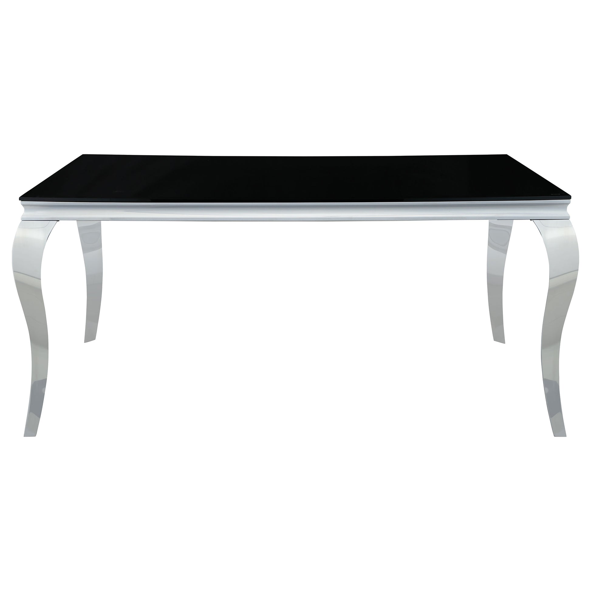 • Polished chrome finish table base features dramatically curved Cabriole legs topped with black tempered glass top