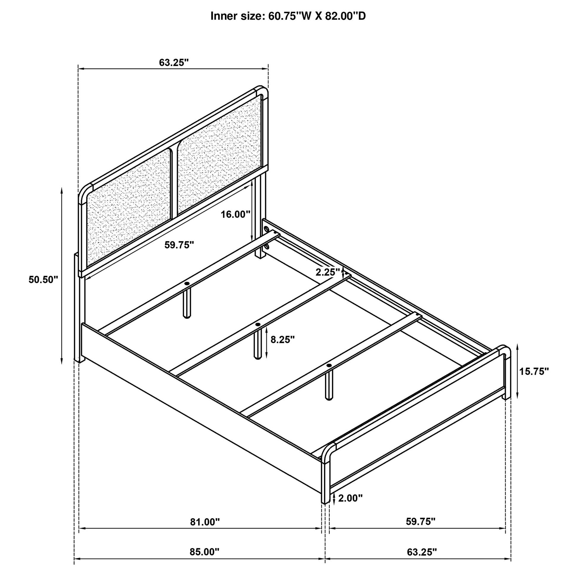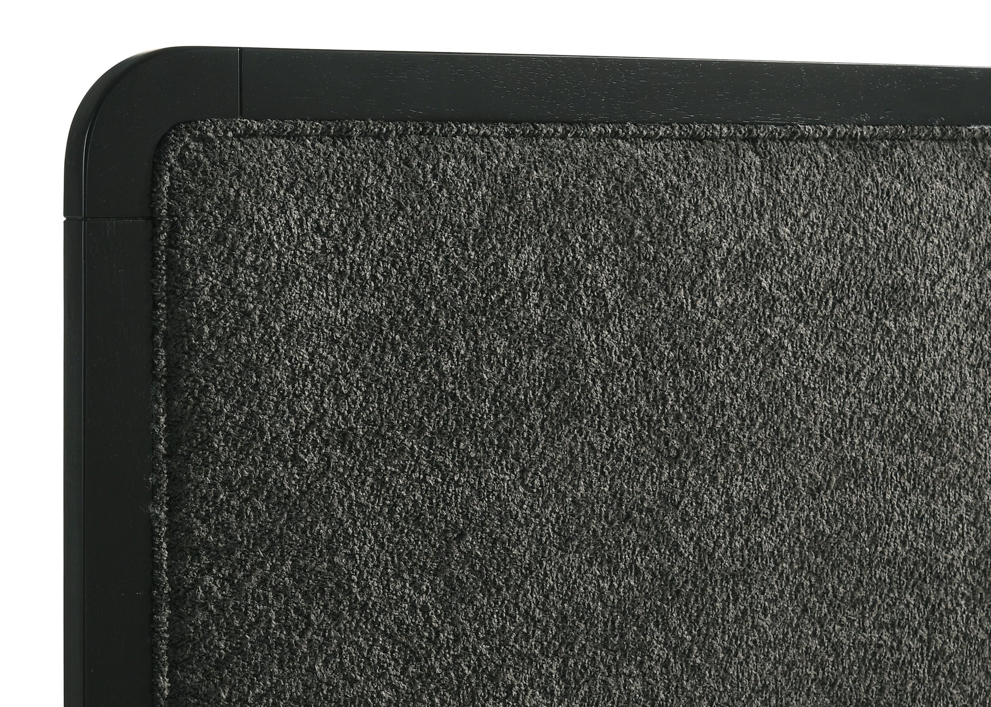Tailored drama abounds in this modern bed with an upholstered headboard. Its crisp black finish pairs perfectly with charcoal fabric to create a deep, bold focal point for your bedroom. The bed boasts a tall headboard and low footboard, offering airy, open personality. Rounded corners complete the look, providing a softened effect for its overall silhouette. The bed is complete with levelers on its legs, allows for compensation for uneven flooring to ensure stability.