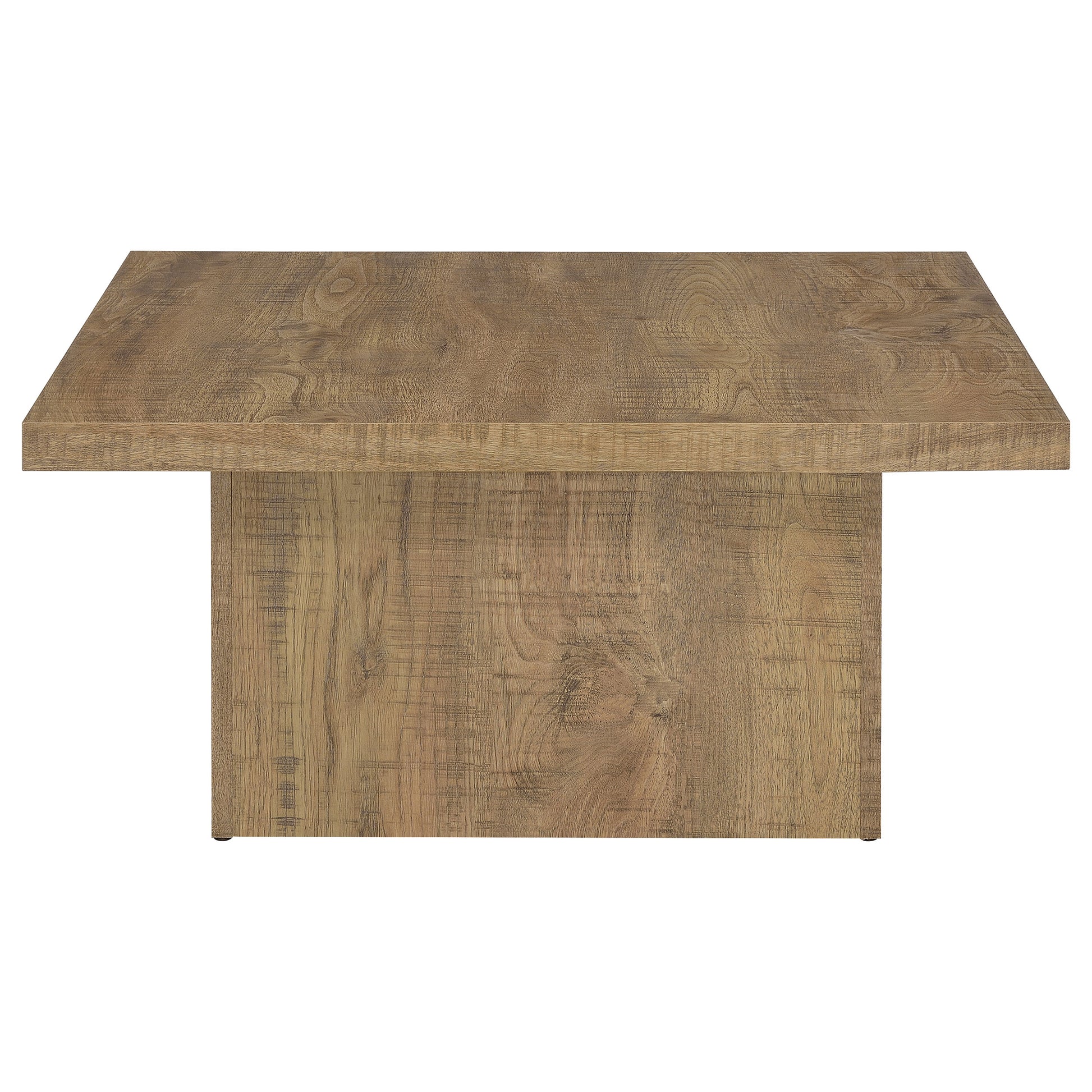Natural ambiance brings a fresh motif to your casual spaces in the form of a square wood coffee table with the power to change up a design scheme. The square coffee table reflects a heady natural vibe with wood grain markings on natural mango finish wood products construction. Its spacious overhang top and oversized block base create delightful optical effects with a low-key feel. Centered in a casual yet elegant room, it speaks to your signature organic design statement. Experiment with suitable ensemble pieces to make the rustic look of this cocktail table a main factor.