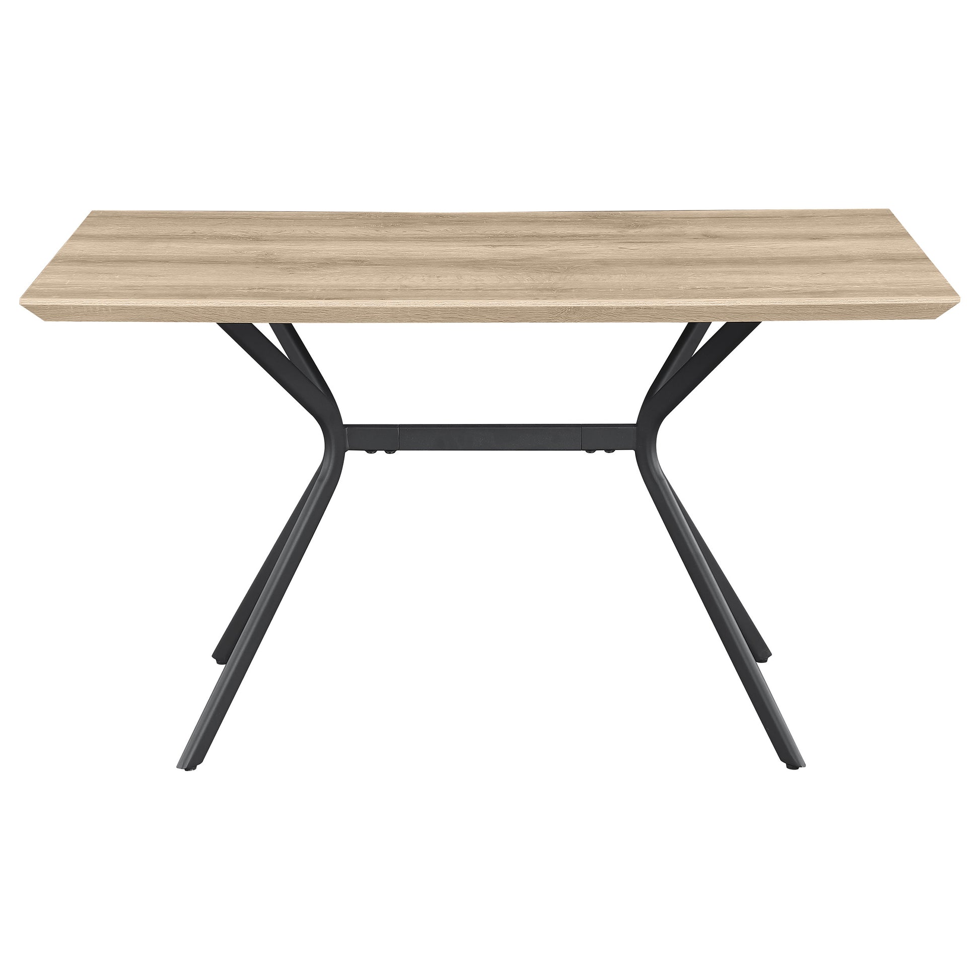 Freshen up your kitchen or dining room with a modern casual dining table. Its rectangular silhouette is versatile and stylish, perfect for multi-functional spaces like breakfast nooks and compact dining rooms. It boasts a medium brown wood grain tabletop finish, crafted with melamine for excellent durability and resistance to denting and scratches. An angled edge adds polished flair, perfect for an approachable, contemporary space. The table's base features four angular V-shaped legs with a crossbar support, all in a black finish over metal construction that provides stability.