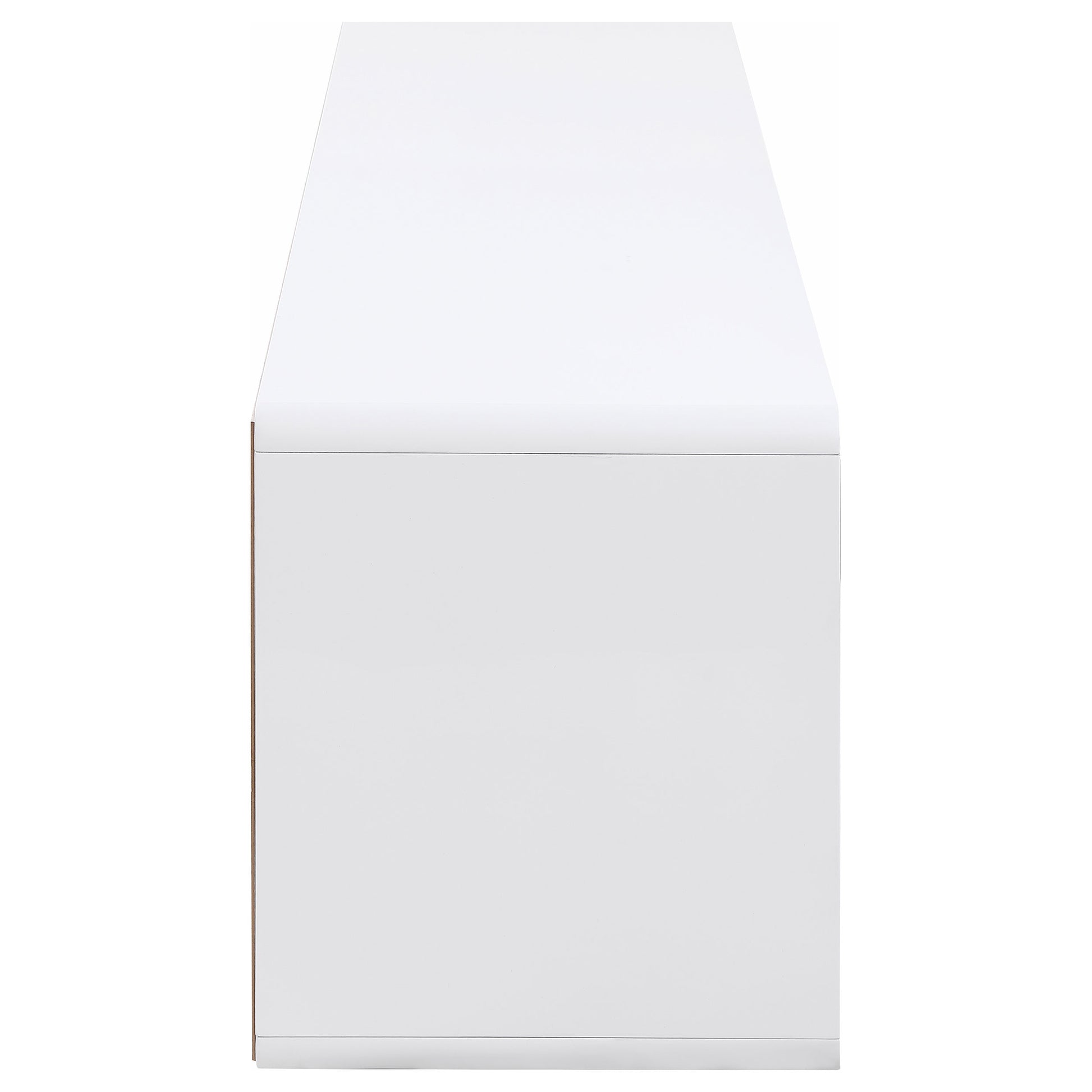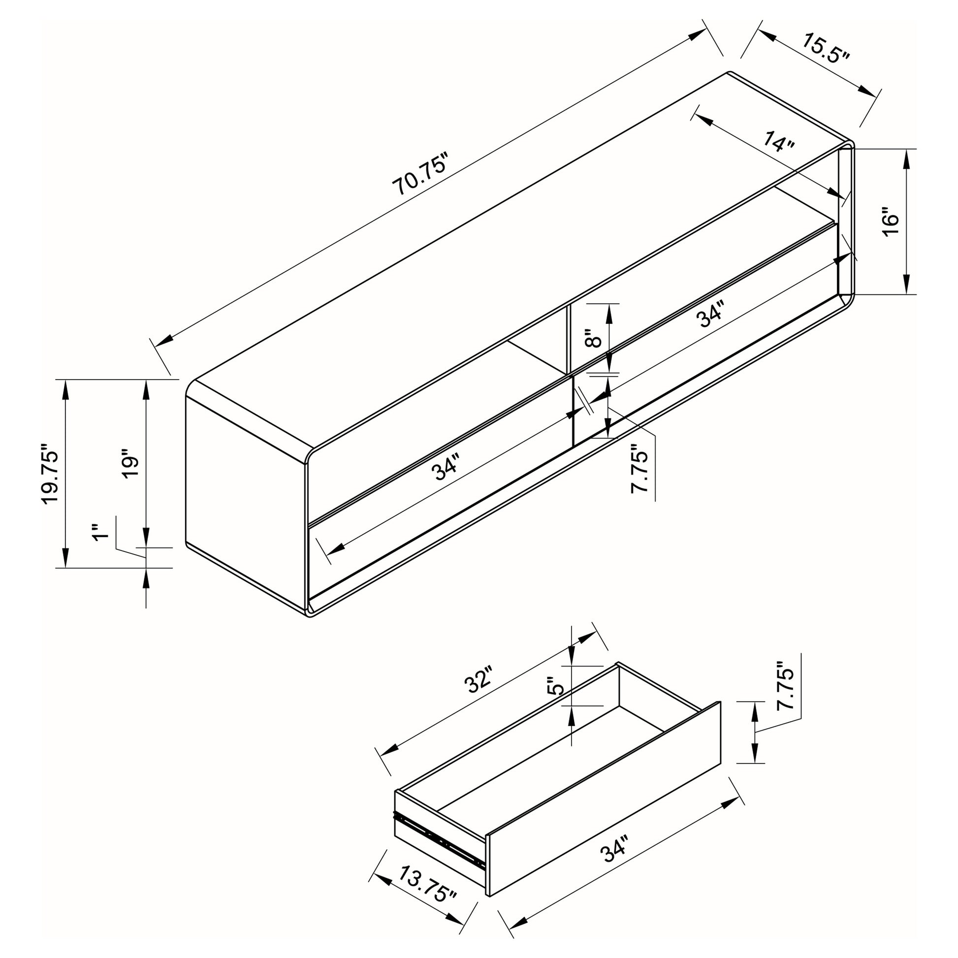 This sleek TV stand brings a crisp, modern look to the living room. Its 71-inch width can accommodate up to a 75-inch screen, creating an ideal media console for contemporary spaces. Crafted from engineered wood with a white high gloss lacquer finish, it offers a refined entertainment center aesthetic. The low-profile frame and two spacious drawers blend minimalism with function, making this a versatile entertainment unit or TV shelf.