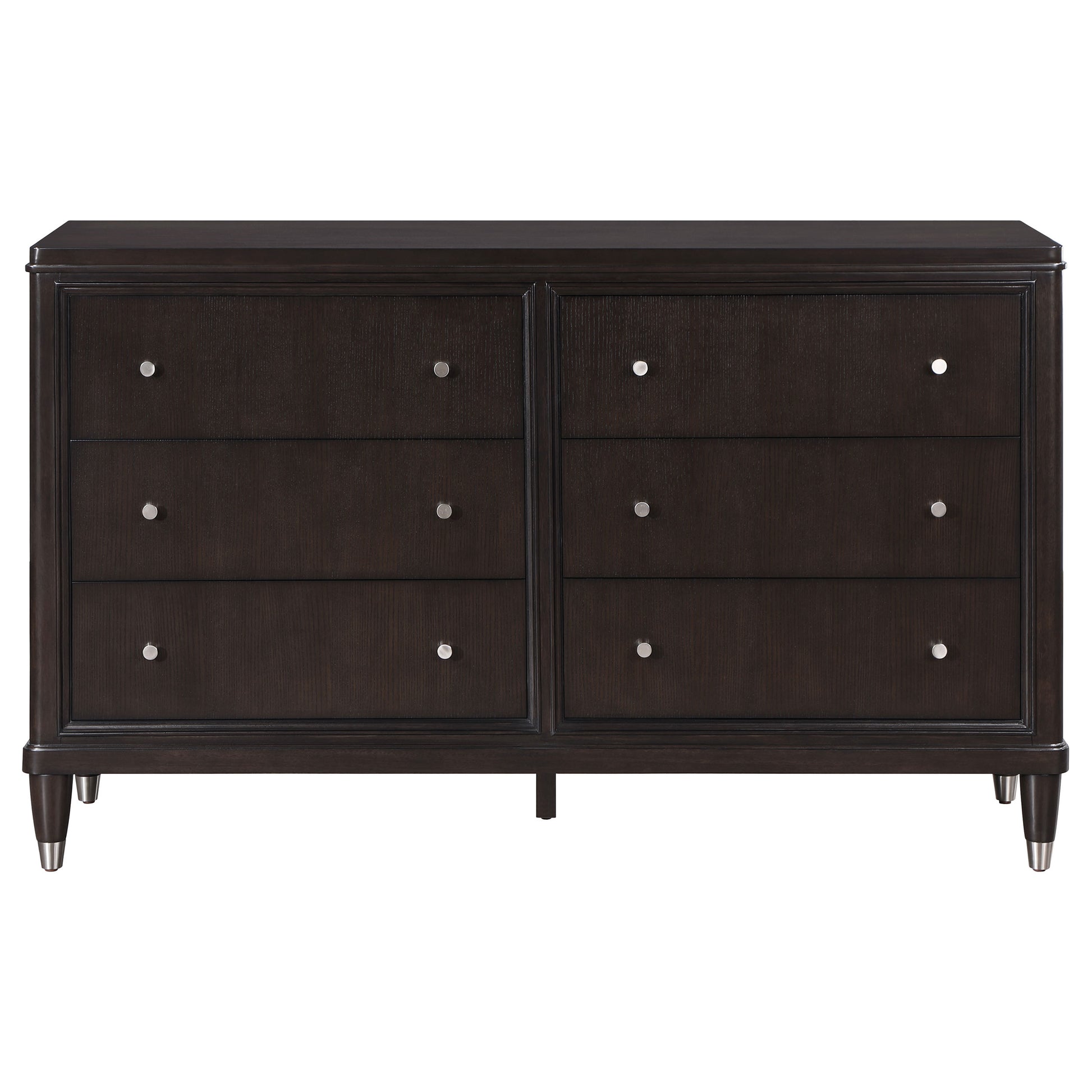 Introduce stylish storage in your bedroom with a modern six-drawer dresser. Its sleek look is accentuated in a dark brown finish, with metallic accents that add depth to tapering feel. Petite knobs decorate each drawer front as drawers offer ample storage for clothing, linens and accessories in your bedroom. The dresser offers a wide top for decor and drawers add protection with felt lining in top drawer and cedar lining and bottom drawers. Add framed photos or a metal sculptural piece to the top of the dresser to add a personal touch.