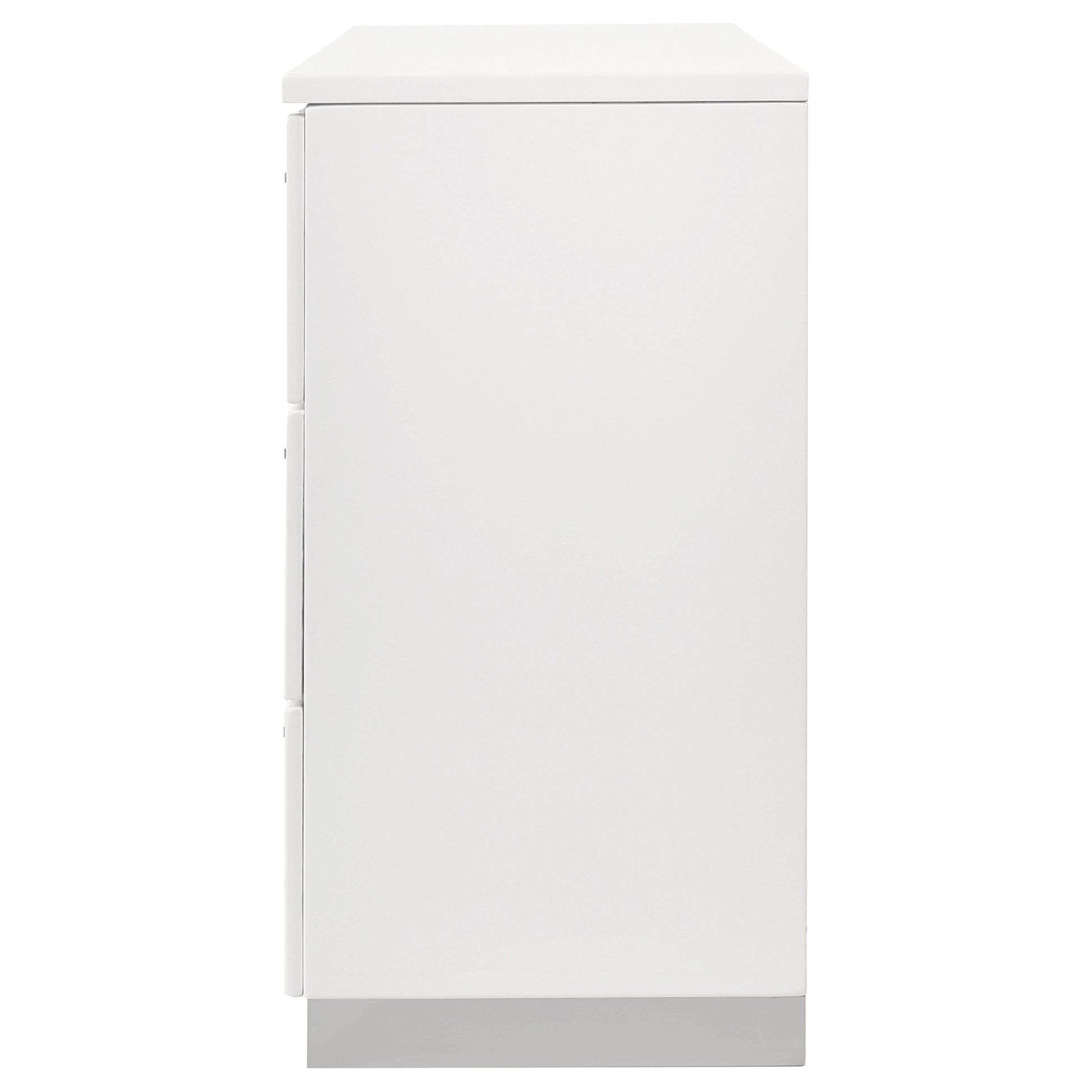 Keep your space organized with the clean lines of this contemporary 6-drawer dresser. A white high gloss finish delivers a polished, modern aesthetic, while chrome-finished metal handles and feet add refined contrast. Each drawer glides smoothly on metal extension hardware, providing easy access to clothing and essentials. Designed for both style and function, this dresser brings practical storage to modern bedrooms.