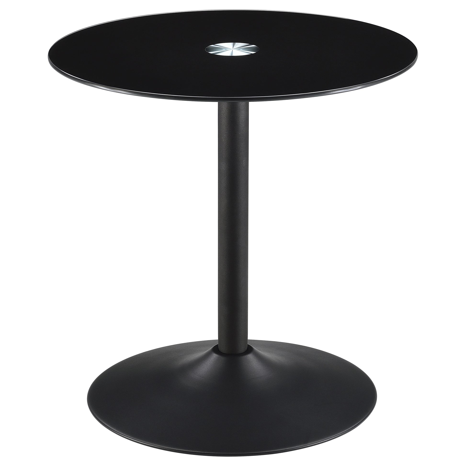 This modern end table features a round black tempered glass top, offering a sleek and durable surface. Its metal tulip base, coated in a black powder finish, delivers both stability and contemporary appeal. Compact and versatile, this side table is perfect for enhancing living room spaces with a functional yet stylish accent. Its sturdy build and minimalist design make it a practical addition to any decor.