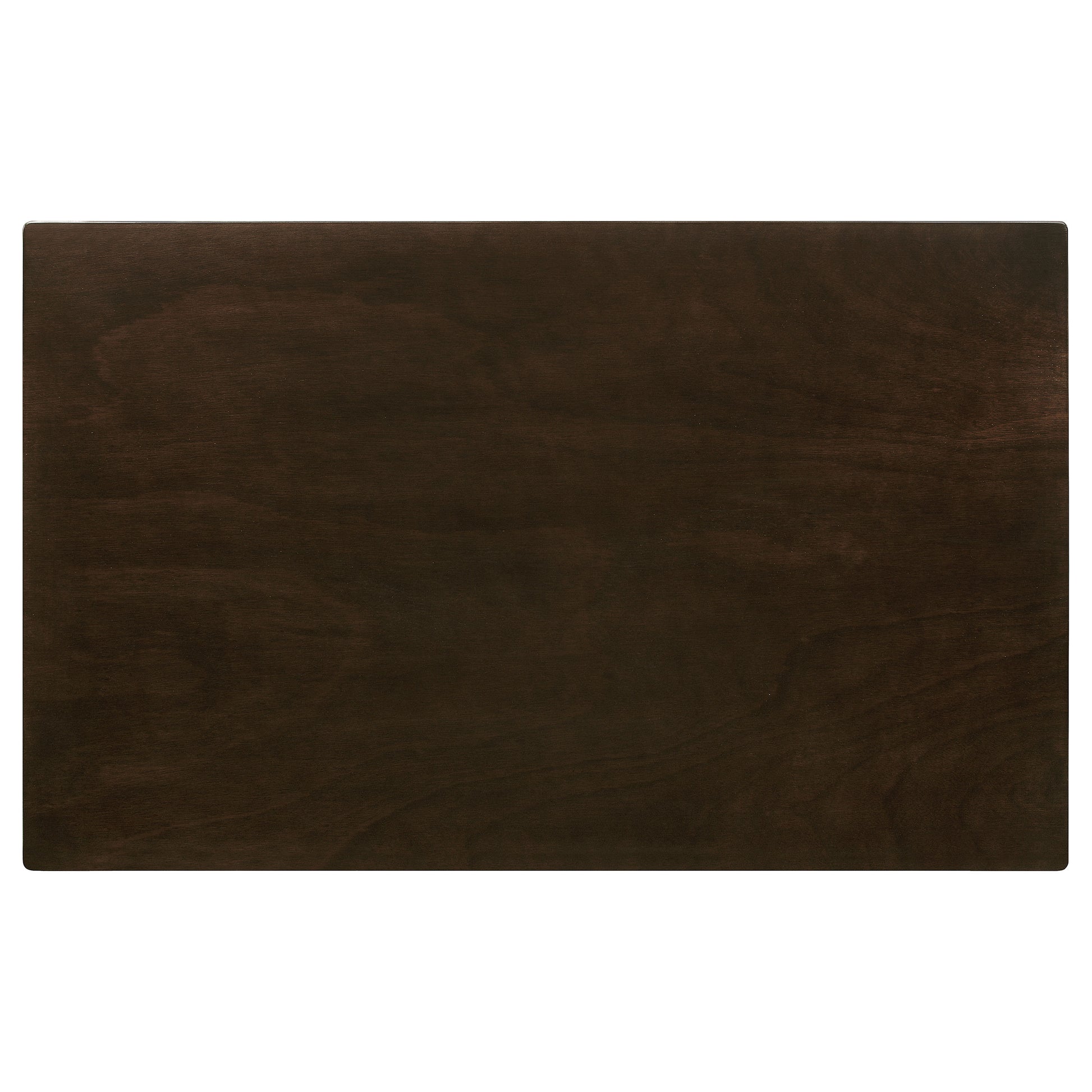 • Rectangular table in cappuccino finish features clean lines and bold tapered legs