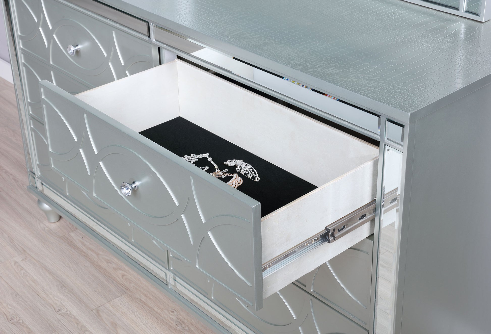 • Silver metallic finish pairs with mirrored trim and crystal hardware throughout