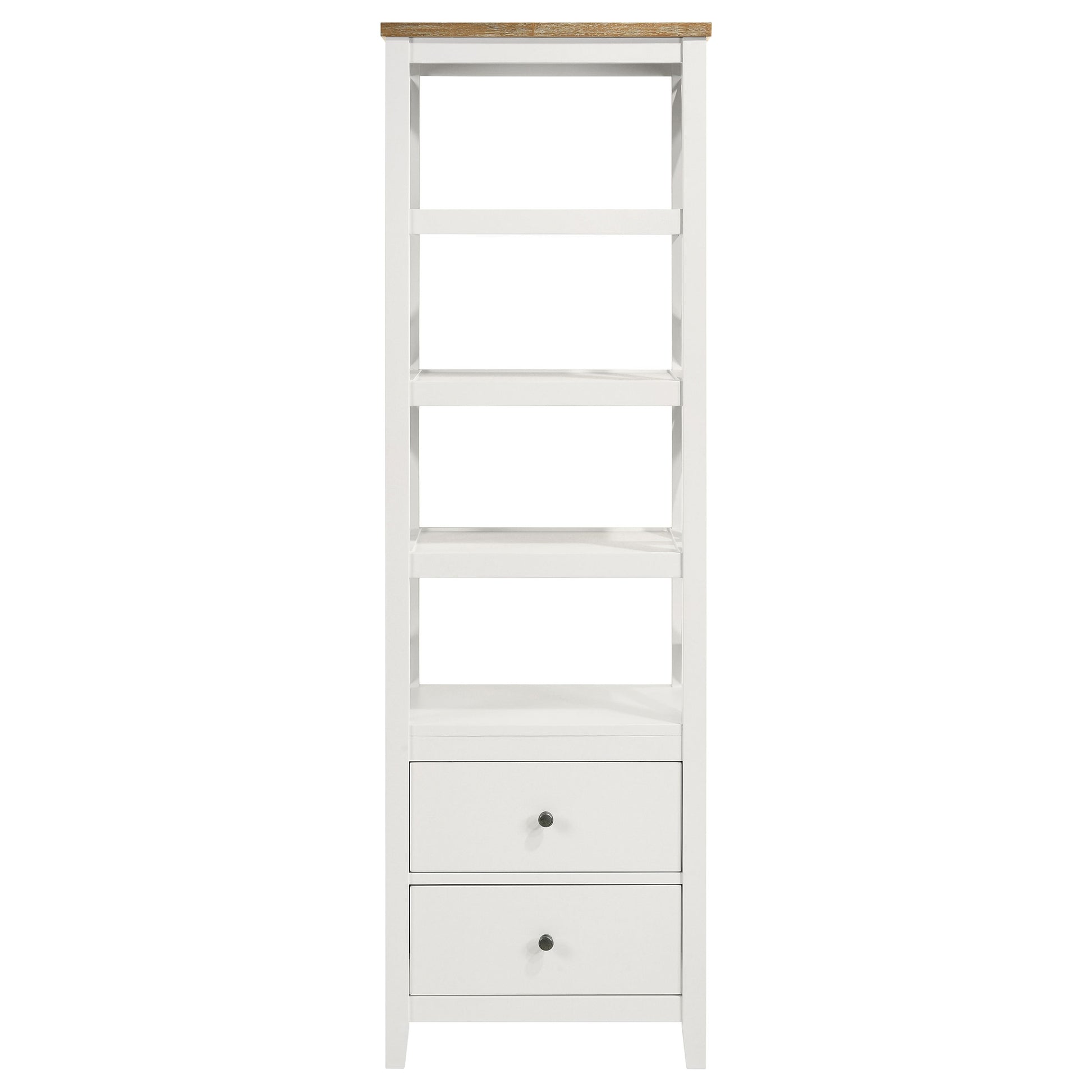 • Brown ash veneer top and white frame with antique silver knobs create charming look