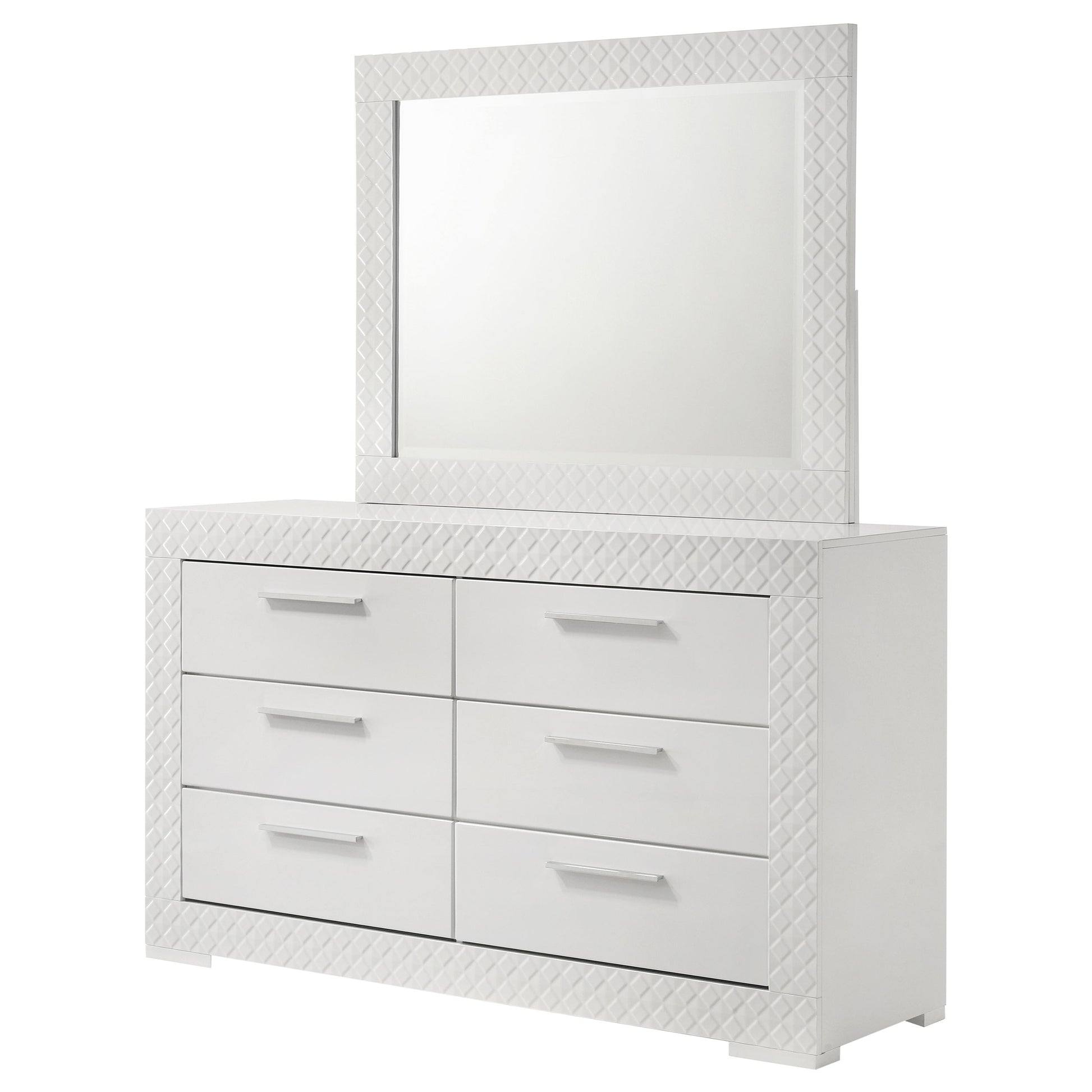 Bring a touch of modern luxury to your bedroom with this dresser and mirror set. Featuring a high gloss finish and 3-dimensional diamond tile emboss, this set exudes contemporary Italian style. The dresser offers ample storage with six spacious drawers, including felt-lined top drawers for delicate items. The matching mirror adds a cohesive element, enhancing the set's sophisticated design. This dresser and mirror set is perfect for those who appreciate refined aesthetics and quality craftsmanship.