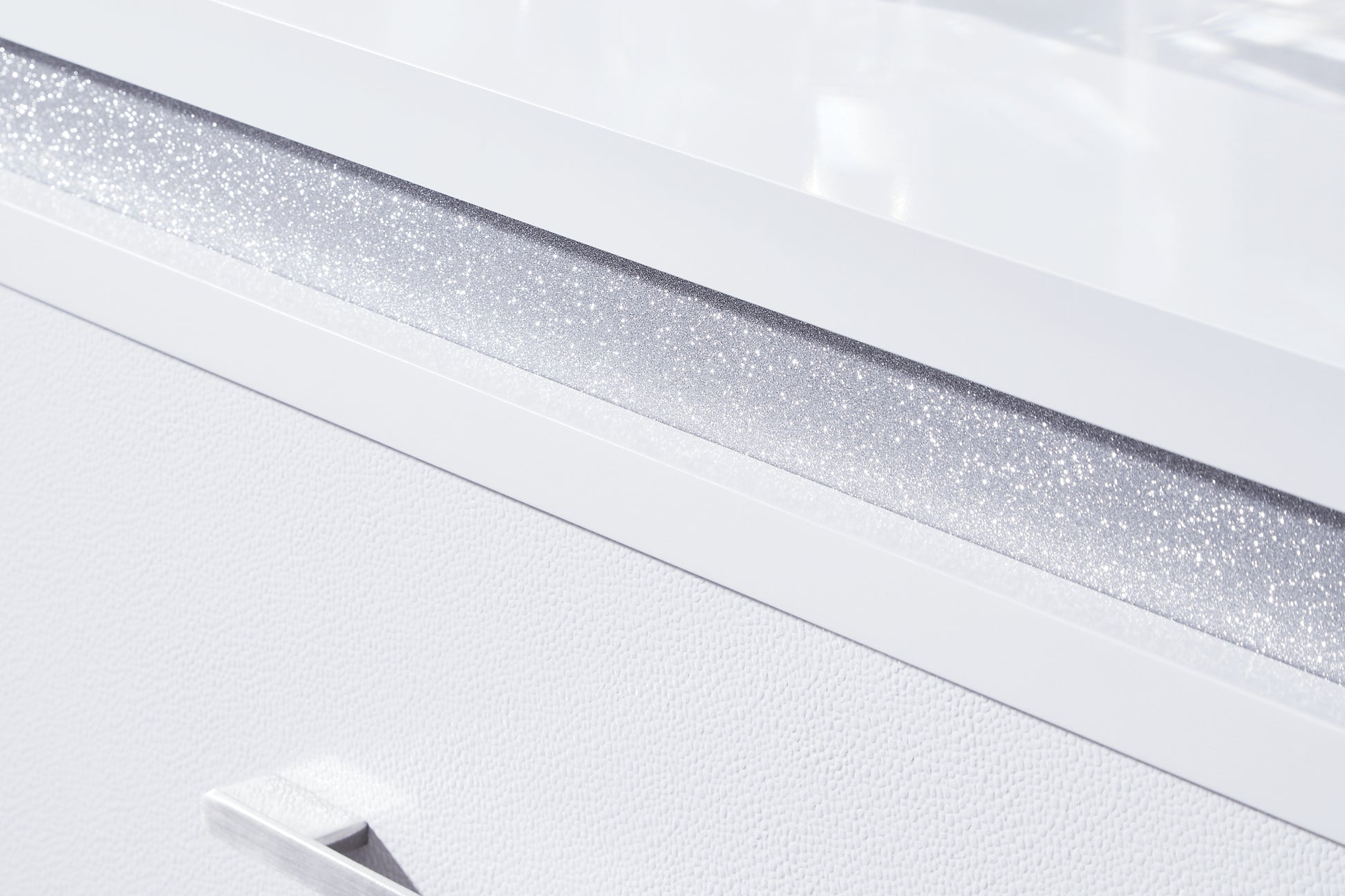 | Details | Made with hardwood solids and MDF substrates, White paint finish, Inset acrylic glitter accents, Horizontal metal drawer pulls, 4 drawers with fully finished interiors, dovetail construction and heavy-duty ball-bearing side glides, Textured drawer fronts | |