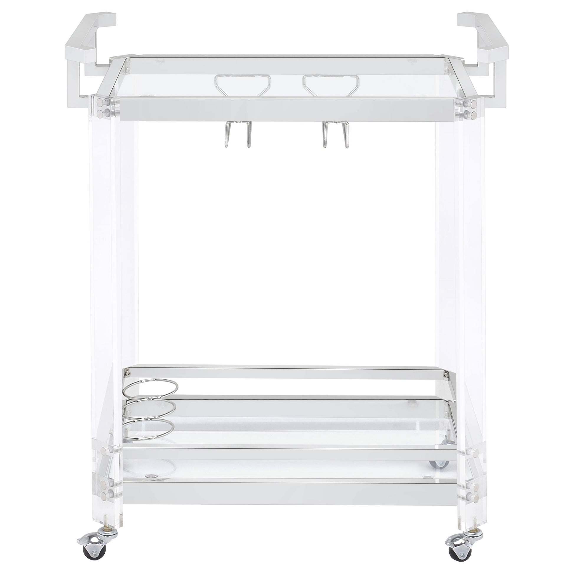 A serving cart is a delightful accoutrement for any home bar or indoor patio. This serving cart takes it to another level with an acrylic and metal frame finished in chrome. It features clear tempered glass shelves that's simple yet modern. Bottom shelf features wine bottle holders while top shelf features a stemware rack underneath. With convenient wheels, take this serving cart wherever drinks are in demand.