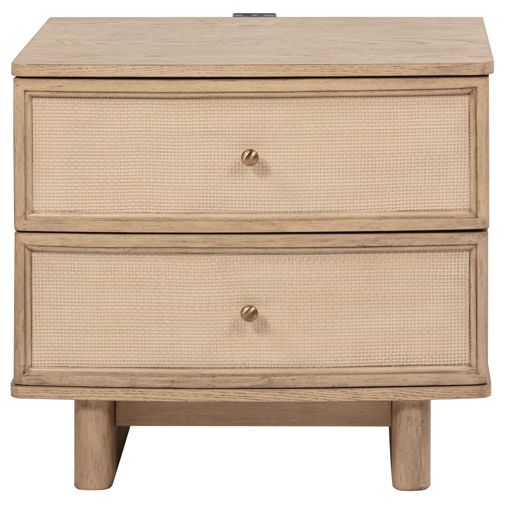 This nightstand combines practicality with elegant design, offering two drawers for convenient bedside storage. Finished in beige oak, it features smooth metal extension glides for easy access and antique brass hardware for a touch of vintage charm. The integrated USB and Type-C charging ports keep your devices powered and within reach. Its clean lines and thoughtful details make this nightstand a perfect fit for any bedroom setting. Enjoy the perfect balance of function and style with this essential piece.