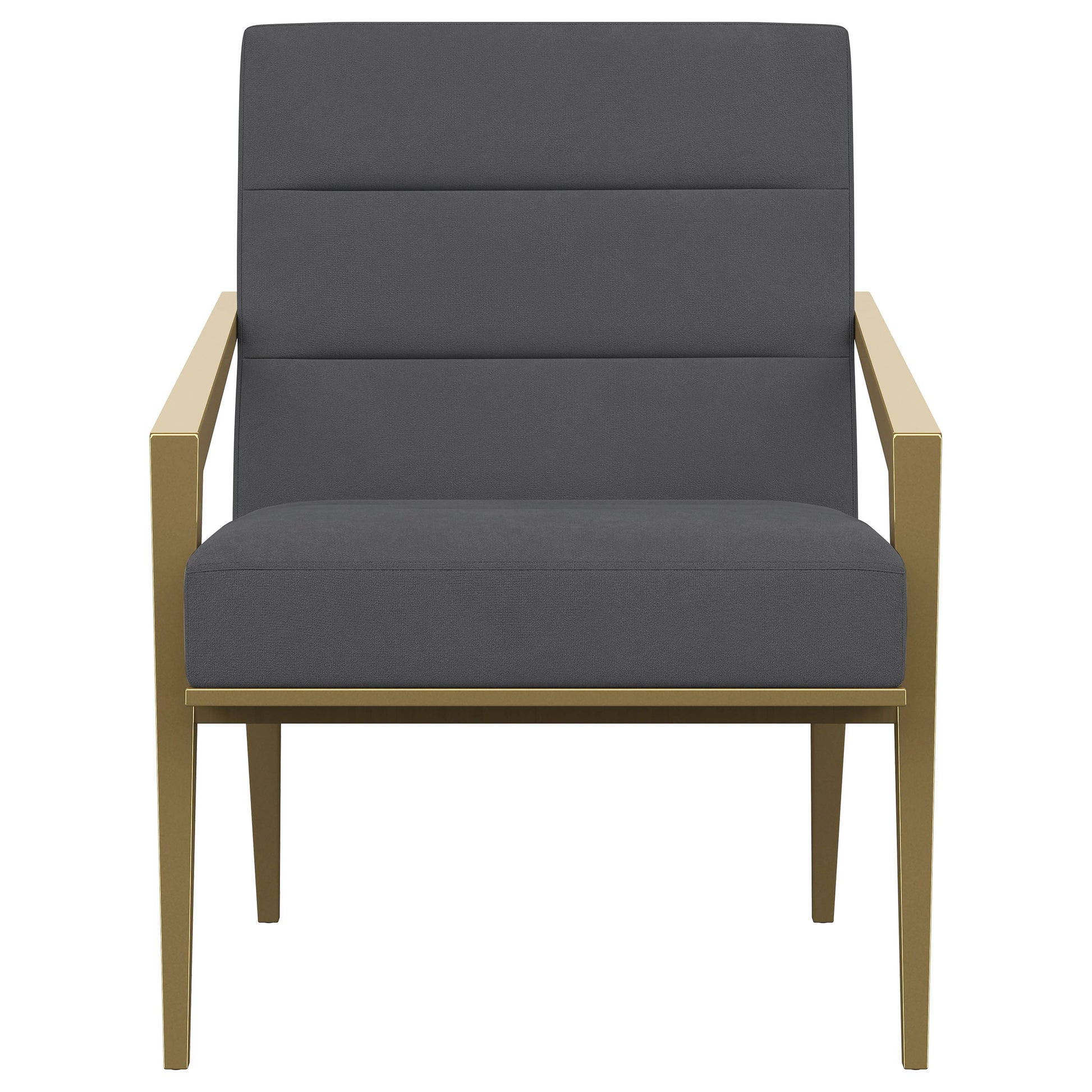 Restrained, modern style meets elegant artistry in a striking contemporary armchair. Designed to stand out, it boasts an upholstered seat and back with a metal frame and arms. The streamlined look receives a gleaming gold finish, adding sophistication anywhere from a sophisticated living room to a refined reception area in a professional space. Sloping, tapered arms define its silhouette, creating an accent chair that's sure to stand out. Channel tufting accents foam cushions, creating a sense of depth and dimension you'll appreciate in any setting.