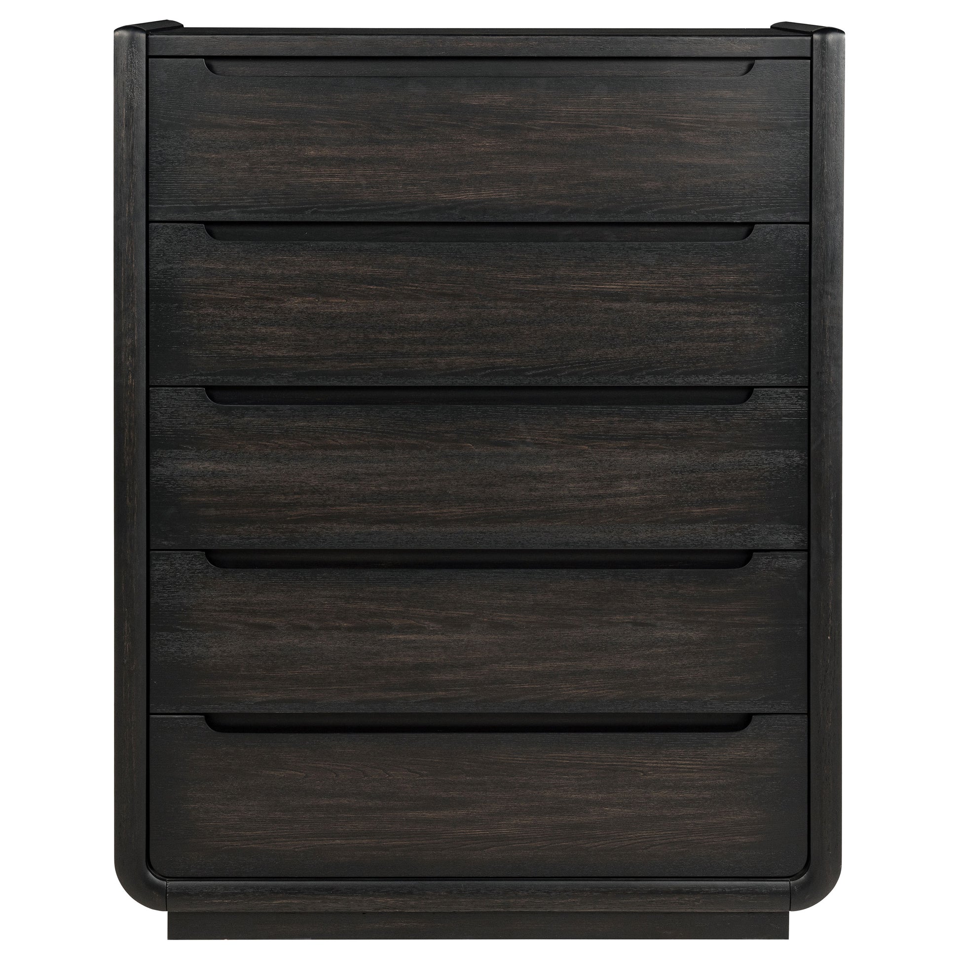 Balance and beauty meet in this five-drawer chest, where softened curves and a deep burnished black finish bring quiet depth to the room. Recessed pulls and rounded corners echo a modern sensibility, while black felt-lined top drawers protect what matters most. Designed with English dovetail joinery, soft-closing glides, and a fully enclosed dust panel, this tall silhouette blends sculptural refinement with everyday function.