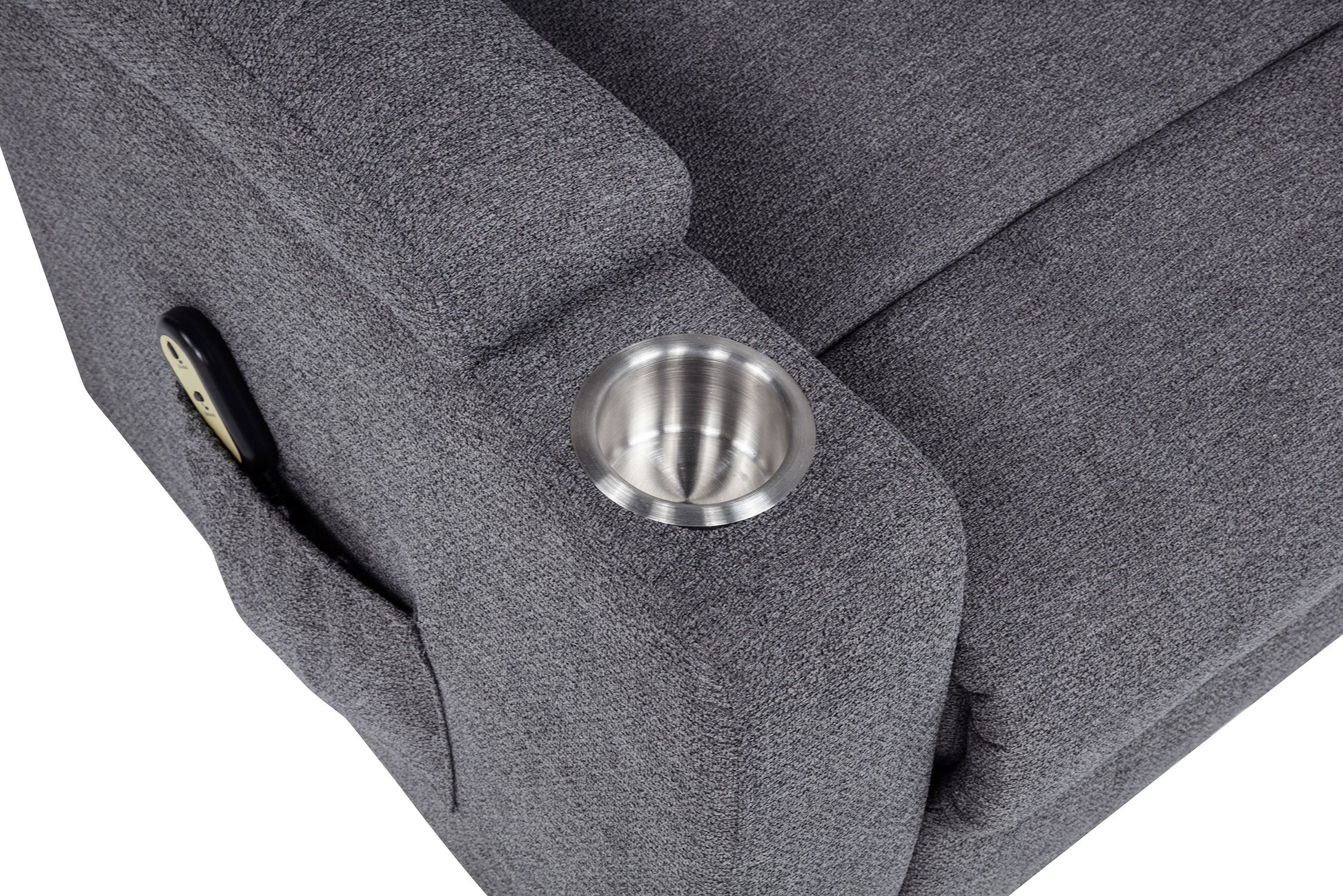 • Power lift massage chair in dark grey chenille offers wired remote-controlled recline and lift