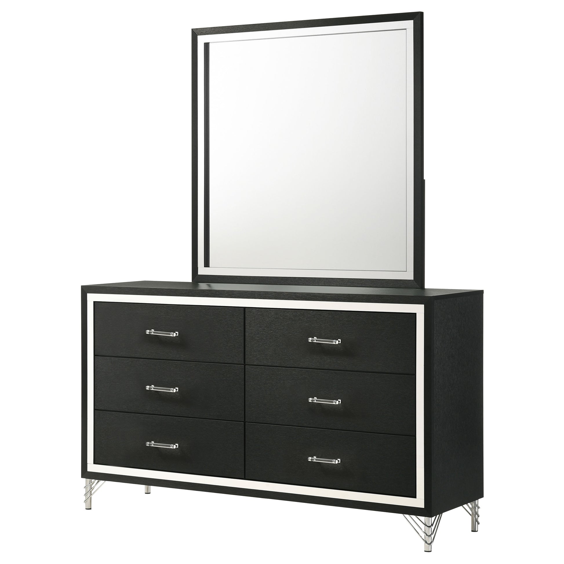 Introduce sophisticated and a hint of glamour with a modern six-drawer dresser and mirror set. Perfect for your stylish bedroom, it offers roomy drawers with smooth interiors perfect for clothing and accessories. The dresser features a bold black finish, with bands of shiny chrome trim and matching hardware and legs. The mirror on top is framed to match the front of the case, creating a sense of cohesion and richness in your dressing area. Decorative legs add a glam touch while the wide top is ideal as a vanity or for decor.