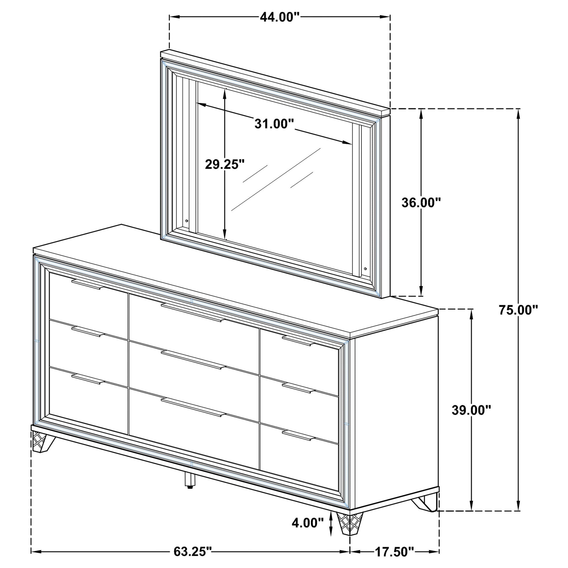 • Dresser with nine drawers, picture framed recessed panels, and embossed herringbone graphic patterns