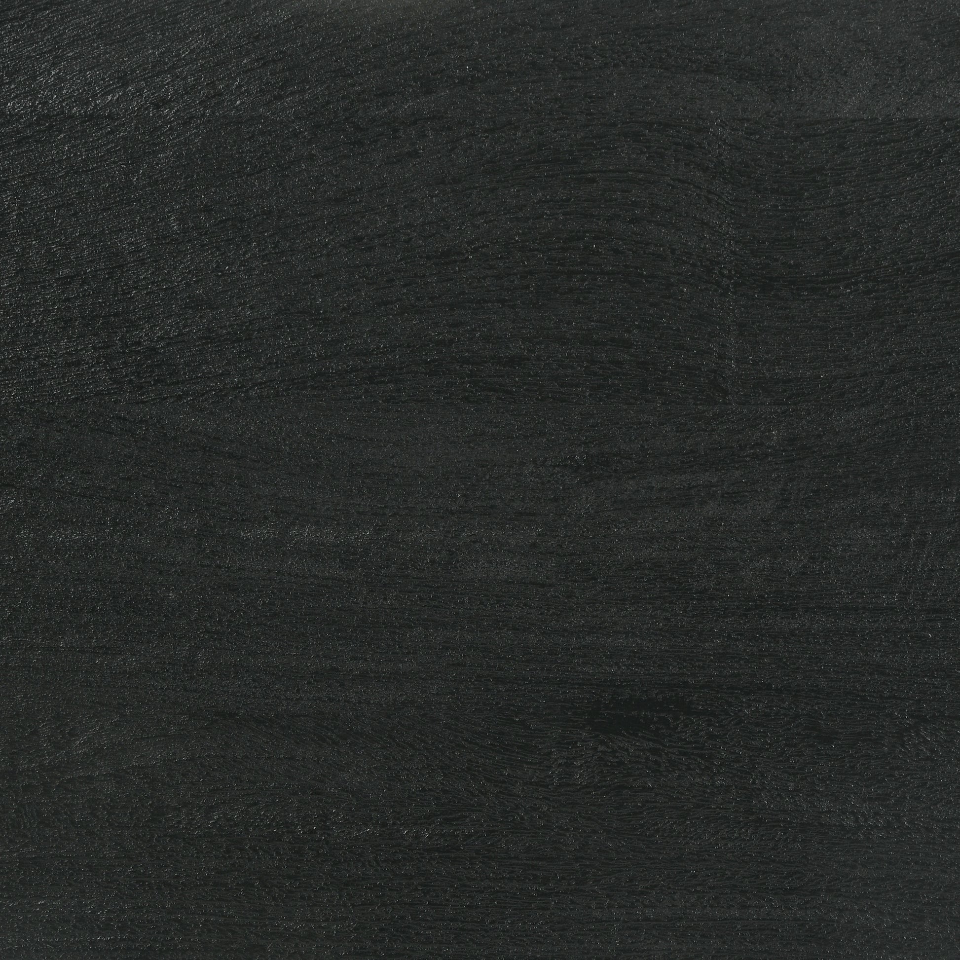 A dramatic charcoal black finish coats wood products construction, adding a bold look to this casual yet elegant TV stand. Gather entertainment-related gear and organize it in this tasteful stand built of mango wood with a rustic aesthetic. Set atop black finish iron bracket legs, it creates a sturdy venue for a large flat-screen TV. Components find room in two side compartments, as incidentals and media may be stashed on a fixed shelf behind two side doors with ornate iron hardware. Avoid clutter with a pre-cut wire management hole.
