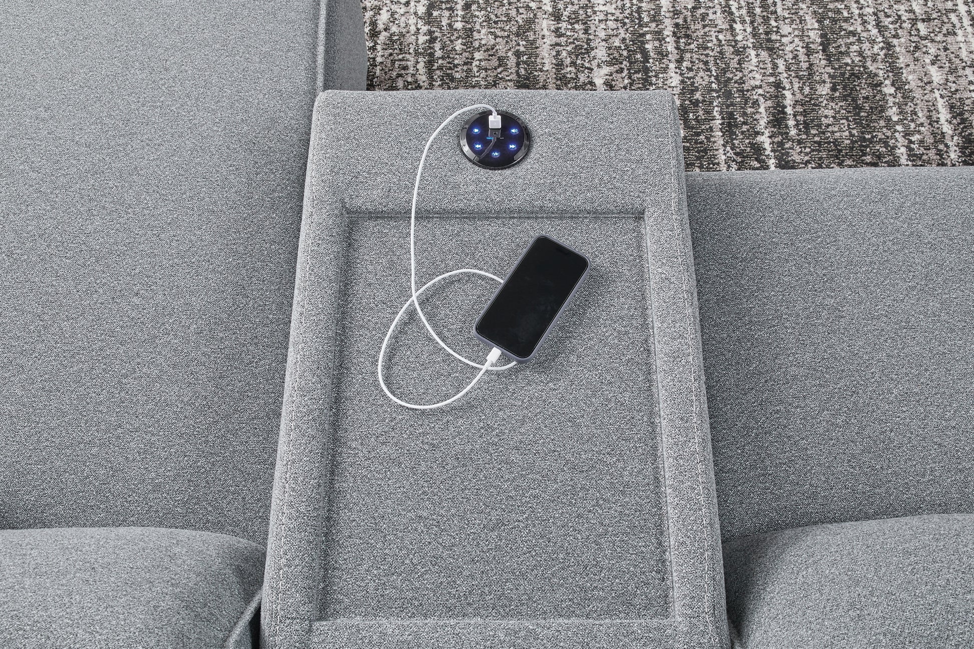 | Details | Includes 5 modular pieces: left-arm facing power recliner, armless chair, 2 consoles with audio systems and right-arm facing power recliner, "Left-arm" and "right-arm" describe the position of the arm when you face the piece, Versatile modular pieces fit together in a variety of configurations, One-touch power control with adjustable positions, Easy View™ adjustable headrest and zero-draw USB port, Zero-draw technology only consumes power when the USB receptacle is in use, Corner-blocked frame with metal reinforced seat, Attached back and seat cushions; high-quality foam cushions wrapped in poly fiber, Polyester upholstery; Next-Gen Nuvella™ is a family-friendly fabric that is soft, easy to clean, stain-resistant and durable, Clean fabric with mild soap and water, let air dry; for stubborn stains, use a solution of 4 oz. bleach to 28 oz. water, Throw pillows with easy-to-remove zippered covers for machine washing; pillows with soft polyfill, Zero wall recliner design requires minimal space between wall and chair back, Console with plexiglass top; built-in audio sound system with wireless connectivity; audio controls located on console; USB charging, Power cord included; UL Listed | |