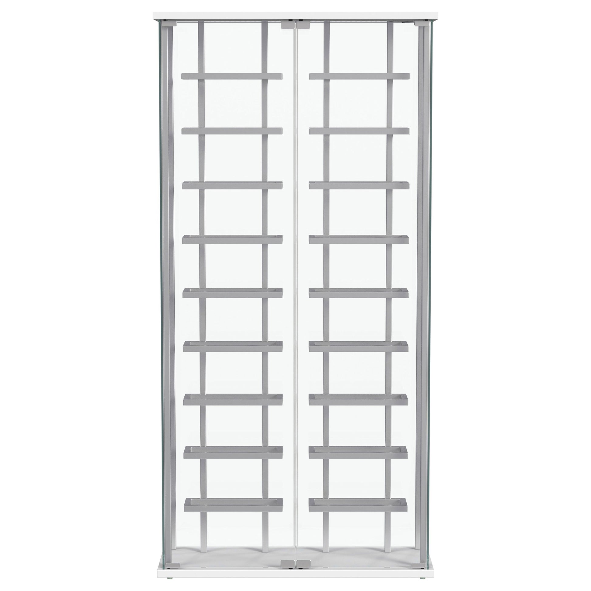 Put the spotlight - literally - on your favorite vintages with a modern bar cabinet. The glass cabinet is crystal clear with built-in LED lighting, offering bright, open flair in your dining room or home lounge. The cabinet features two glass doors with chrome hardware, offering a matching look to interior shelving. Shelves hold up to 18 of your favorite bottles of wine, showing them off to their best effect. The LED light is operated with a touch switch, making it simple and easy to highlight prized vintages.
