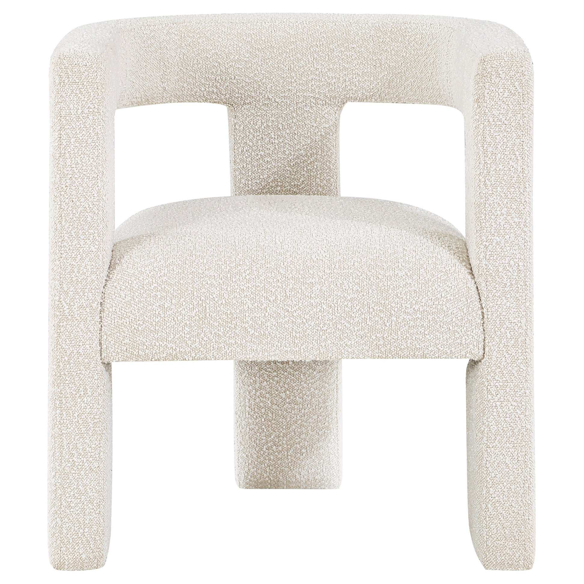 Enveloped entirely in the embrace of plush bouclé, this chair redefines the art of relaxation with its all-fabric design. The seamless transition from the cushioned seat to the curved arms, all robed in the same soft fabric, creates a cocoon of comfort. This chair's silhouette is a gentle wave of tranquility, its form an ode to the curves found in nature. The uninterrupted bouclé upholstery invites a serene tactile experience, transforming the chair into a modern sanctuary. It's a haven of softness, a singular statement of elegance and ease.