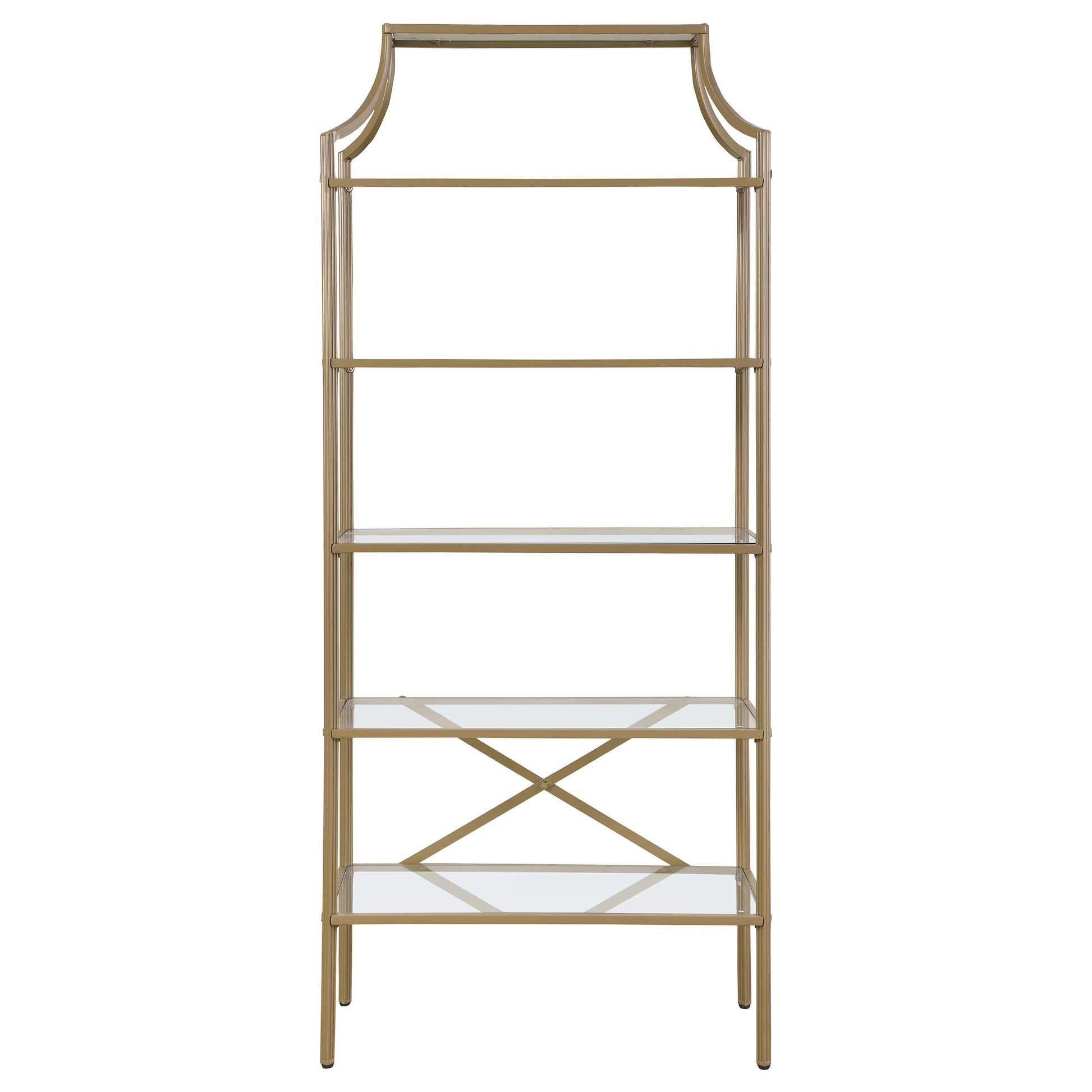 A call for strength and style gets answered by this bookcase. Contemporary style allows for easy placement within your space. The stylish metal frame in gold creates conversation. Enjoy durability as all glass elements are tempered. Updated unit boasts five (5) open shelves for use as storage or display.