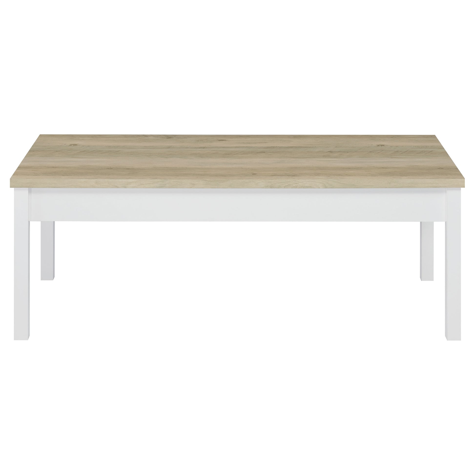 An updated version of farmhouse style is soft and easy on the eyes as this three-piece wood coffee table set is a viable option for your family room or living room. Casual and yet nicely designed, this set offers a versatile finish palette of distressed pine and white over wood products. Clean lines add an easy optical effect. Make your space a simple yet stylish venue with tables designed to last through redesigns. Set includes one rectangular coffee table and two end tables.