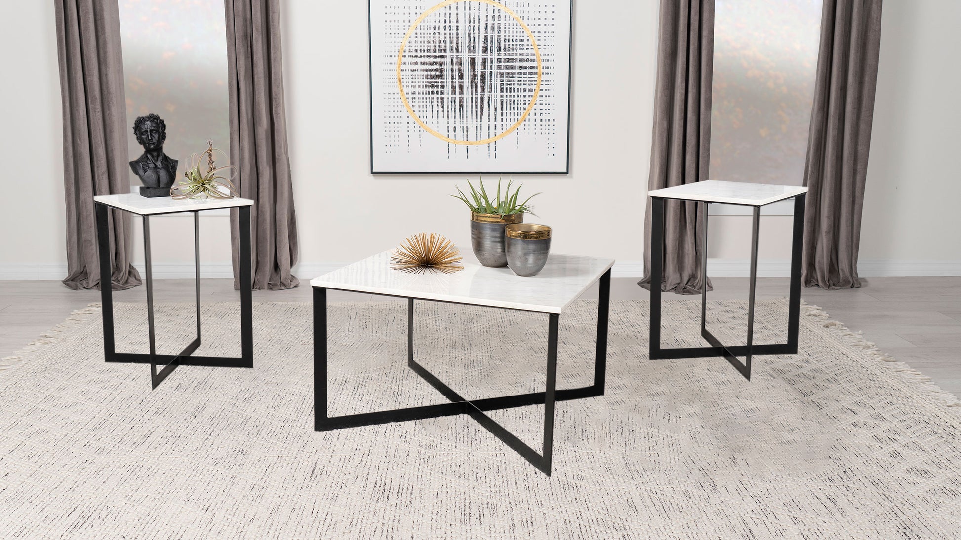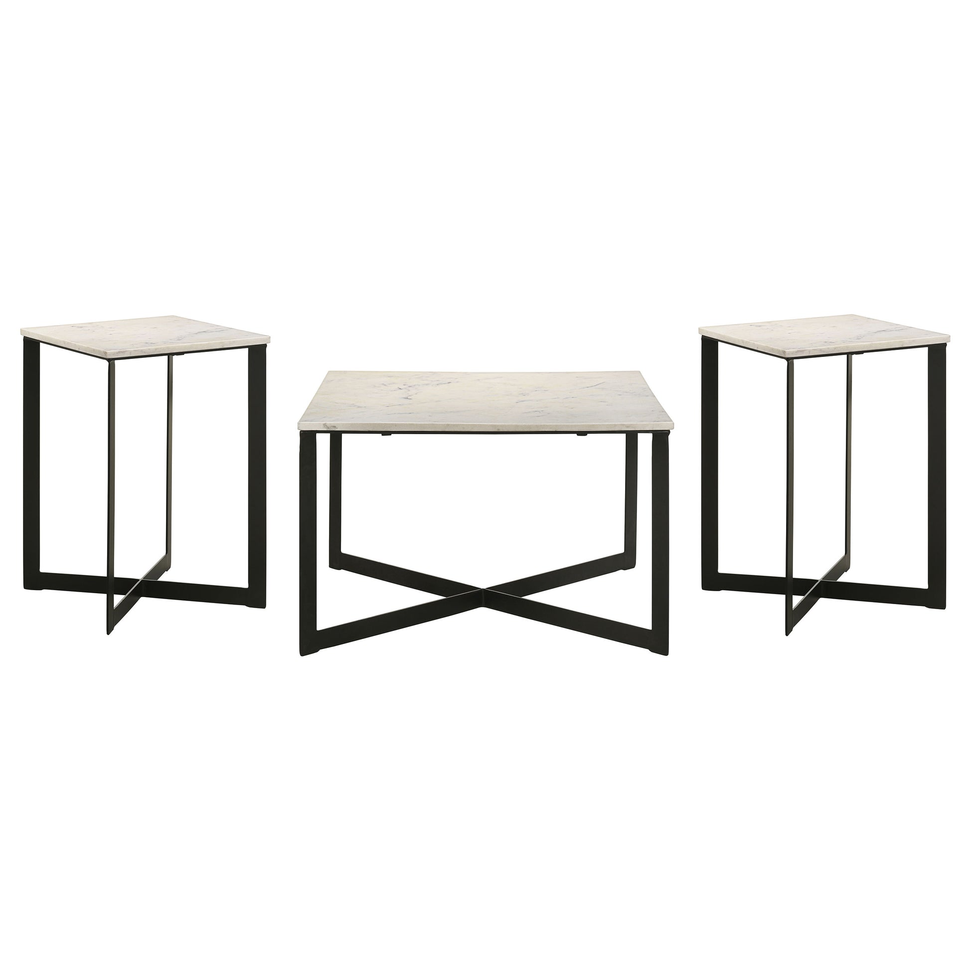 Elevate your living space with this stunning coffee table set, merging modern style with luxurious materials. Each piece features a genuine white marble top, detailed with elegant gray veining for timeless sophistication. The sturdy black powder-coated solid metal frames showcase crisscross bases, delivering a bold, architectural aesthetic. Straight edges and clean lines complete the minimalist yet striking design. Perfect for glam, industrial, or contemporary interiors, this occasional table set transforms any room with refined charm.