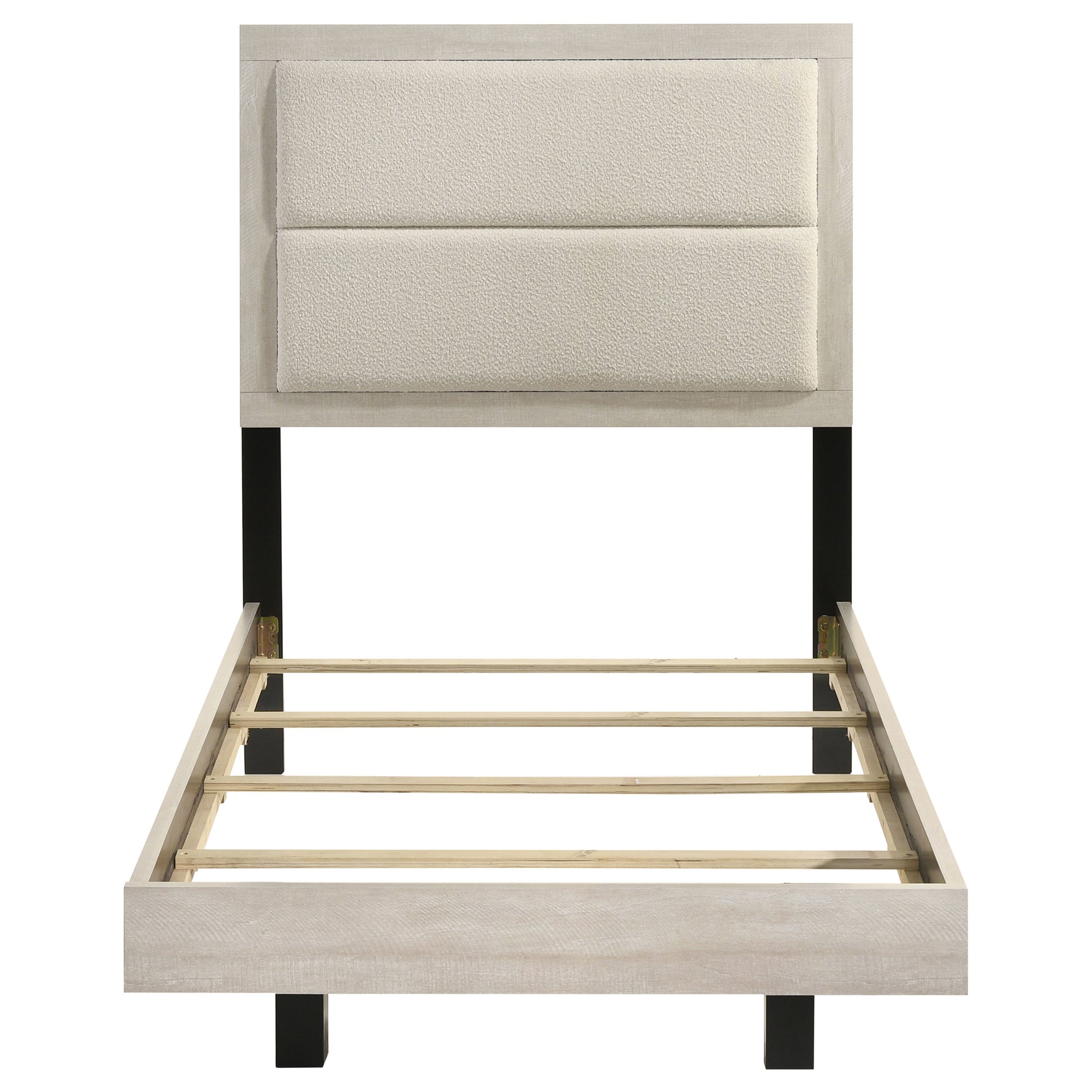 • Headboard upholstered in cream bouclé fabric for added softness and style