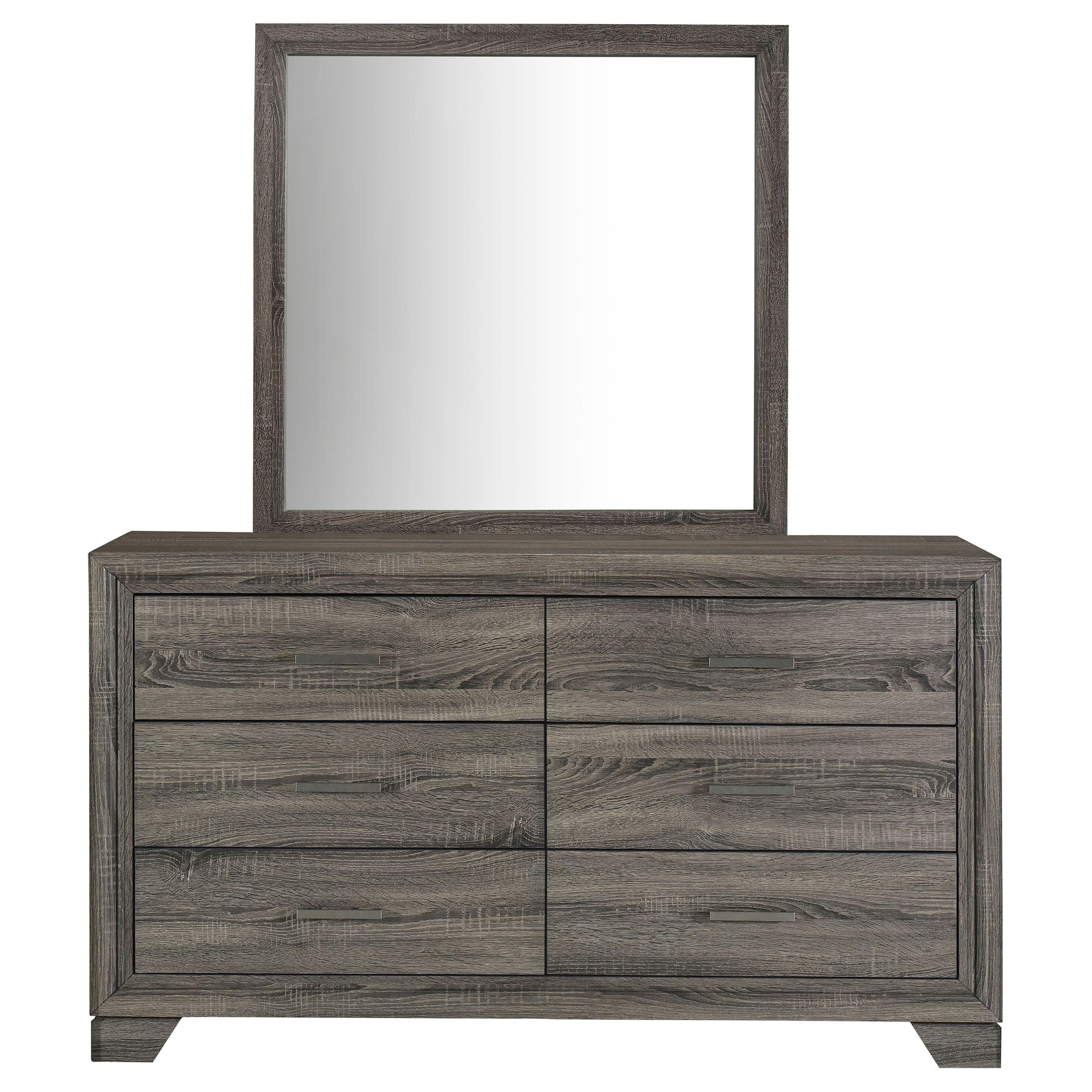 Complete your bedroom storage ensemble with the roomy space in this transitional six-drawer dresser with a framed mirror that attaches directly to the back of the dresser. It boasts a brown oak wood grain finish over laminate surfaces, creating a stylish look that resists everyday wear and tear. The dresser delivers roomy storage in drawer with smooth metal glides and bar pulls, adding the perfect hint of contrast and depth. Mitered trim adorns the front of the case and complements the frame on the mirror to create a sense of angular precision. Use the wide top for a jewelry box and a vase of flowers, or select decor that brings personalized aesthetics to your inviting bedroom.