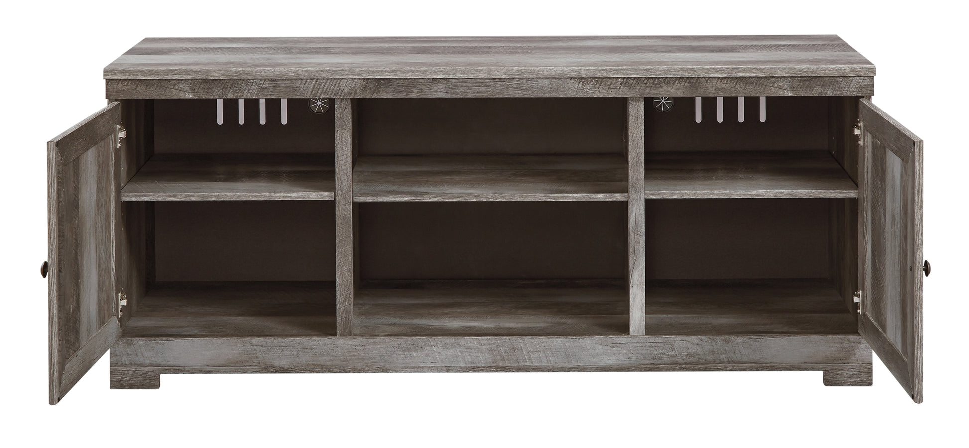 | Details | Includes TV stand, 2 piers, bridge and electric fireplace insert (W100-02), Made with engineered wood (MDF/particleboard), Rustic gray finish over replicated oak grain, Plank effect, TV stand with 2 storage cabinets (each with an adjustable shelf) and removable/adjustable center shelf, Each pier with 2 glass shelves and cabinet door revealing single-shelf storage; overhead LED lighting; reversible cabinet doors and can open left or right with consumer assembly modification, Cutouts for wire management and ventilation, Electric fireplace insert provides up to 4,608 BTU/1,400W and warms up to 400 square feet (heats a mid-size room) , 6-level temperature setting; 5 levels of flame brightness; overheating control device, LED-lit flame operates with or without heat; option for placing faux glass crystals or stones (included), Remote control with LED display, Power cord included; UL Listed, Assembly required; simply remove the center shelf and back panel to make room for the fireplace insert | |
